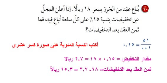 يباع عقد من الخرز بسعر 18 ريالا اذا اعلن المحل عن تخفيضات بنسبة 15 علي كل سلعة تباع فيه فما ثمن العقد مجتمع الحلول