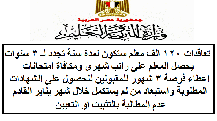 التعليم التعاقدات لمدة سنة تجدد لـ 3 سنوات وراتب شهرى ومكافاة امتحانات وعدم المطالبة بالتثبيت و3 شهور لاستكمال الشهادات حتى يناير