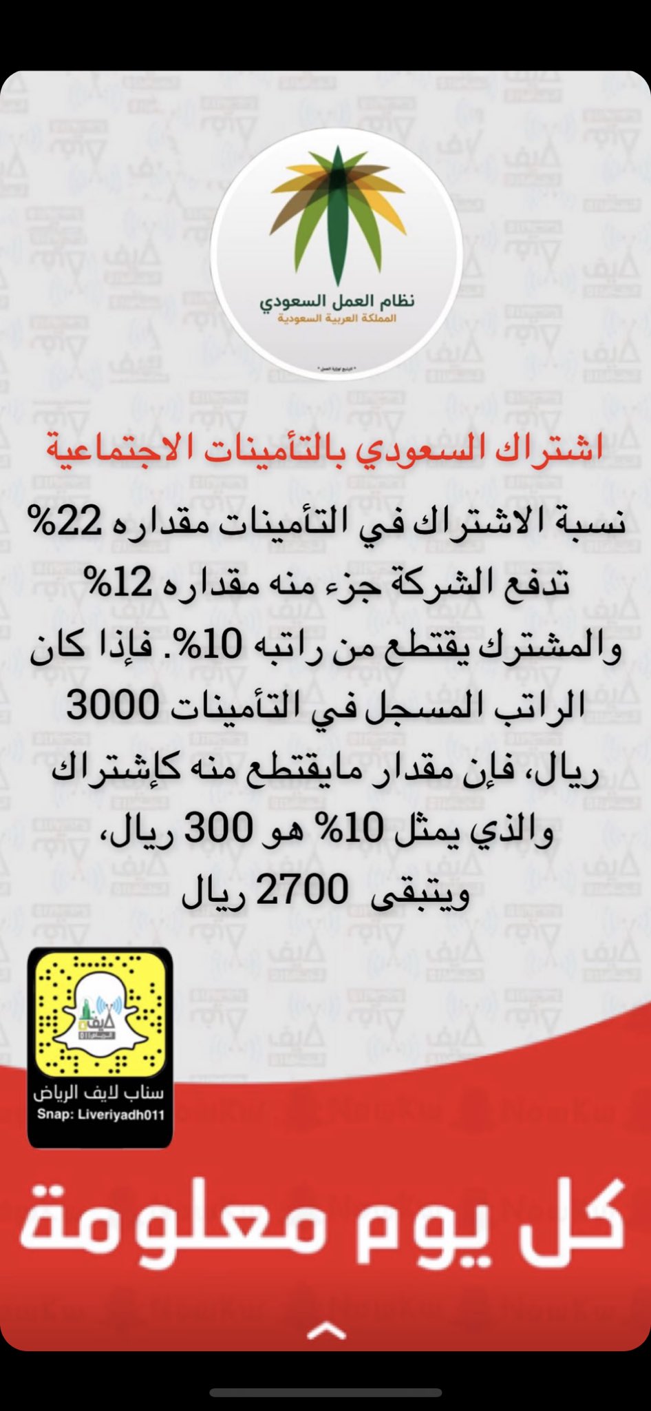 لايف الرياض No Twitter معلومة فايدة اشتراك السعودي بالتأمينات الاجتماعية نسبة الاشتراك في التأمينات مقداره 22 تدفع الشركة جزء منه مقداره 12 والمشترك يقتطع من راتبه 10 فإذا كان الراتب المسجل