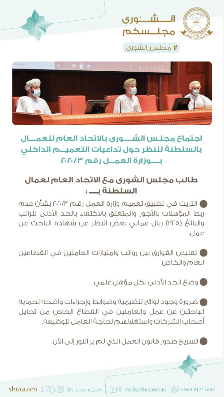 ট ইট র مجلس الشورى خلال اجتماع مجلس الشورى بالاتحاد العام لعمال السلطنة اليوم استمع إلى موقفهم من التعميم الصادر من وزارة العمل من الناحية القانونية والمعيشية نظر في ردات الفعل المجتمعية حوله وحول تداعيات