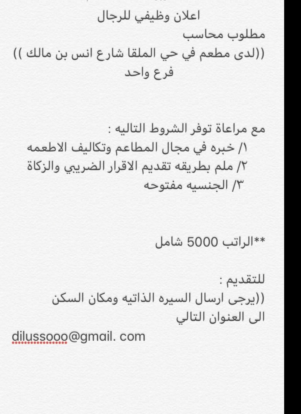 وظيفة محاسب في مطعم في الرياض براتب 5000 ريال للسعوديين وغير السعوديين